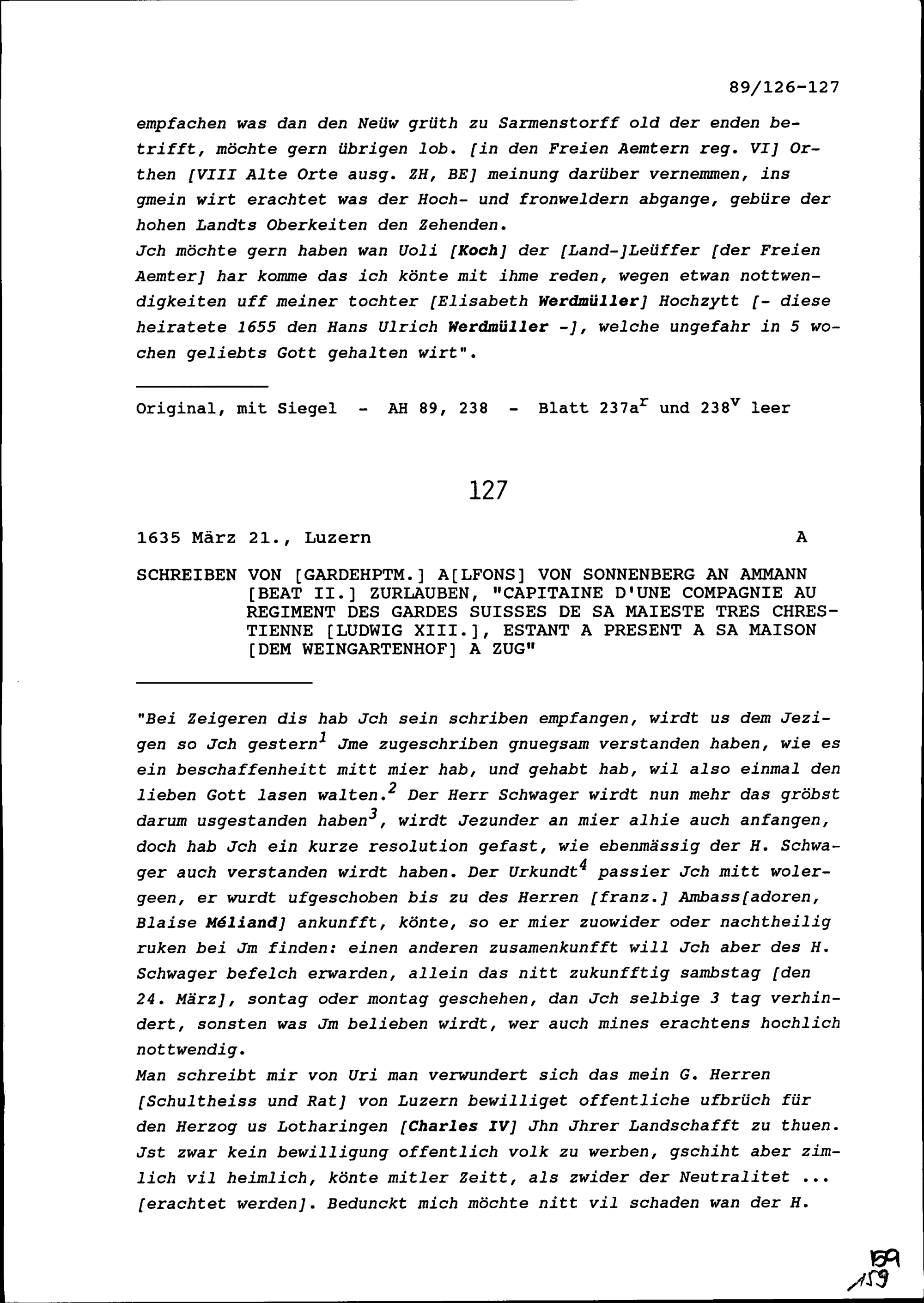 Schreiben von Hans Konrad Werdmüller, Altlandvogt der Freien Ämter und Rat Zürich, an Beat Jakob I. Zurlauben, Landschreiber der Freien Ämter und Major, Bremgarten