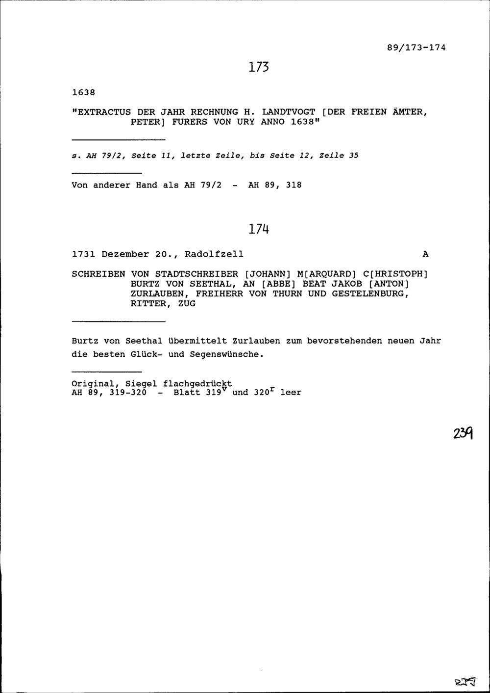 Schreiben von Johann Marquard Christoph Burtz von Seethal, Stadtschreiber, an Beat Jakob Anton Zurlauben, Priester, Zug