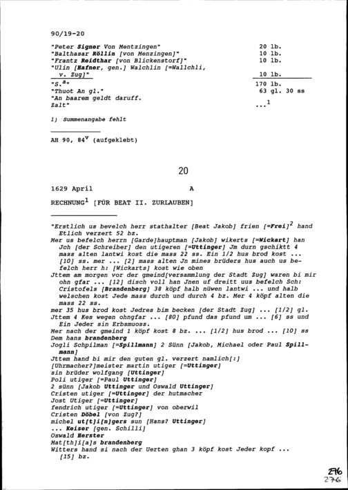 Abrechnung von Beat II. Zurlauben, Ammann Zug, über Bussengelder