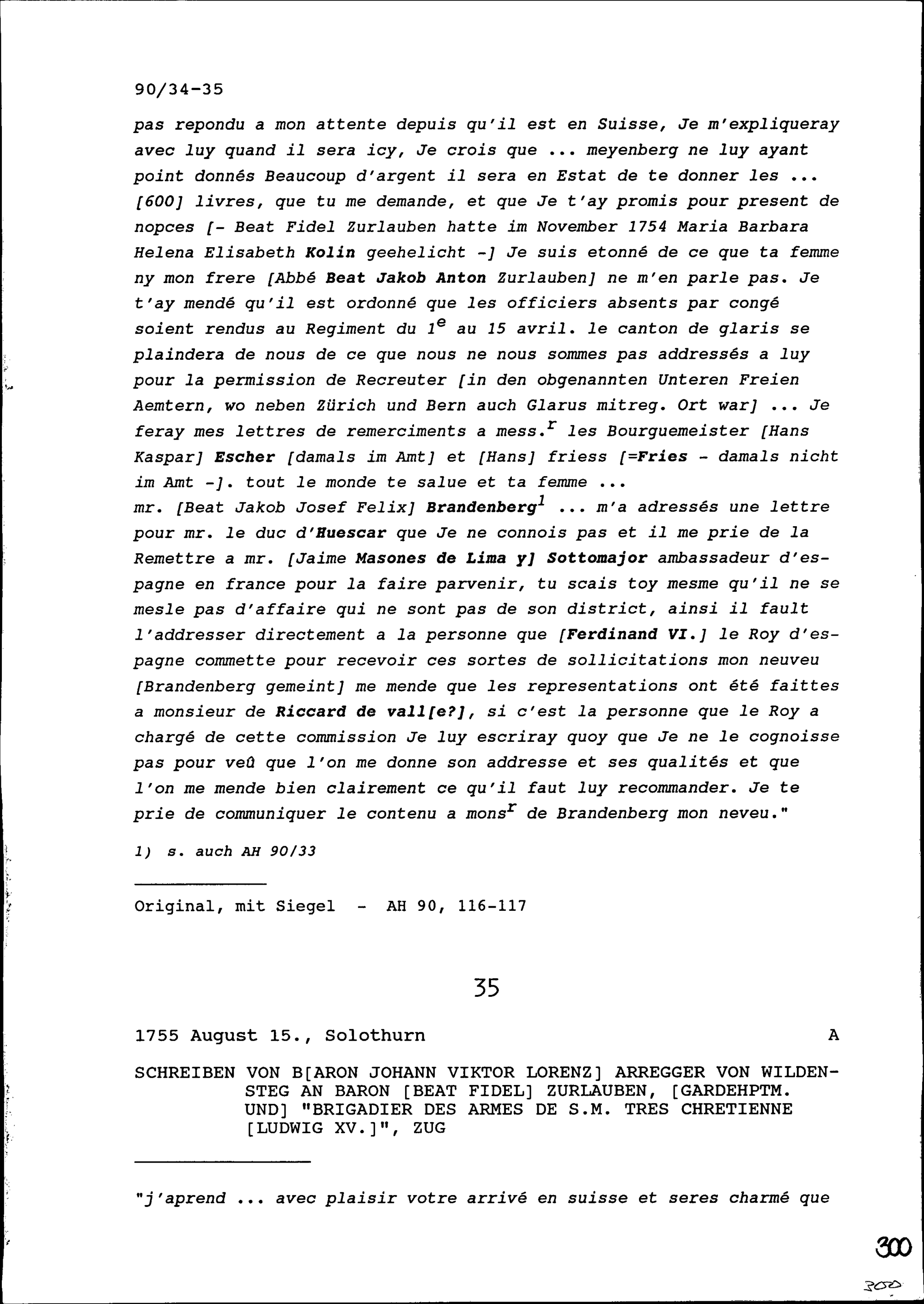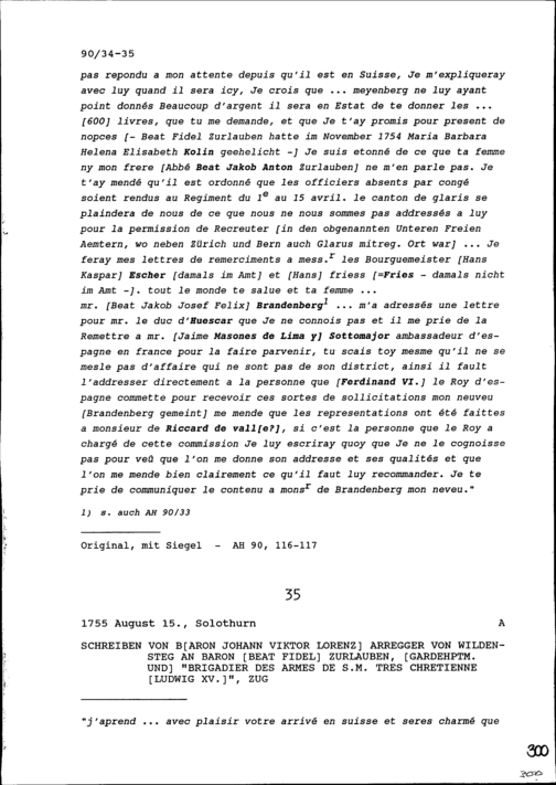 Schreiben von Beat Franz Plazidus Zurlauben, Gardeoberst, an Beat Fidel Zurlauben, Gardehauptmann, Zug
