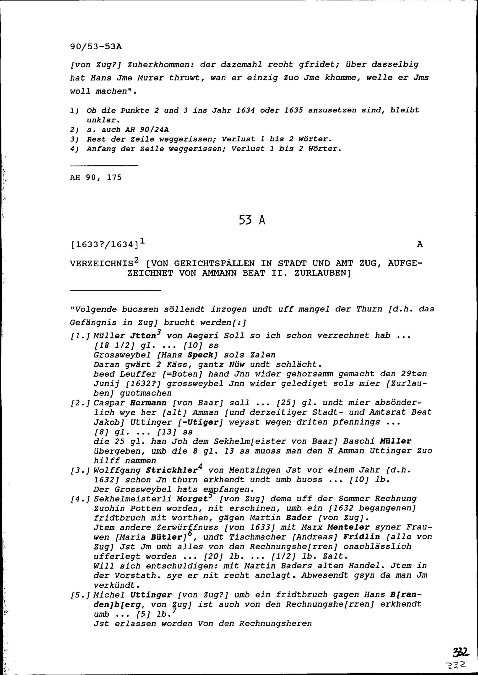 Notiz von Beat II. Zurlauben, Ammann, über Gerichtsfälle in der Stadt Zug