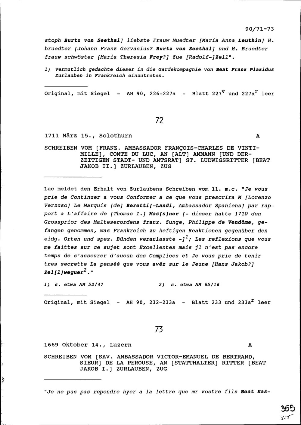Schreiben von Victor-Emanuel de Bertrand, Sieur de la Pérouse, Ambassador von Frankreich, an Beat Jakob I. Zurlauben, Statthalter, Zug