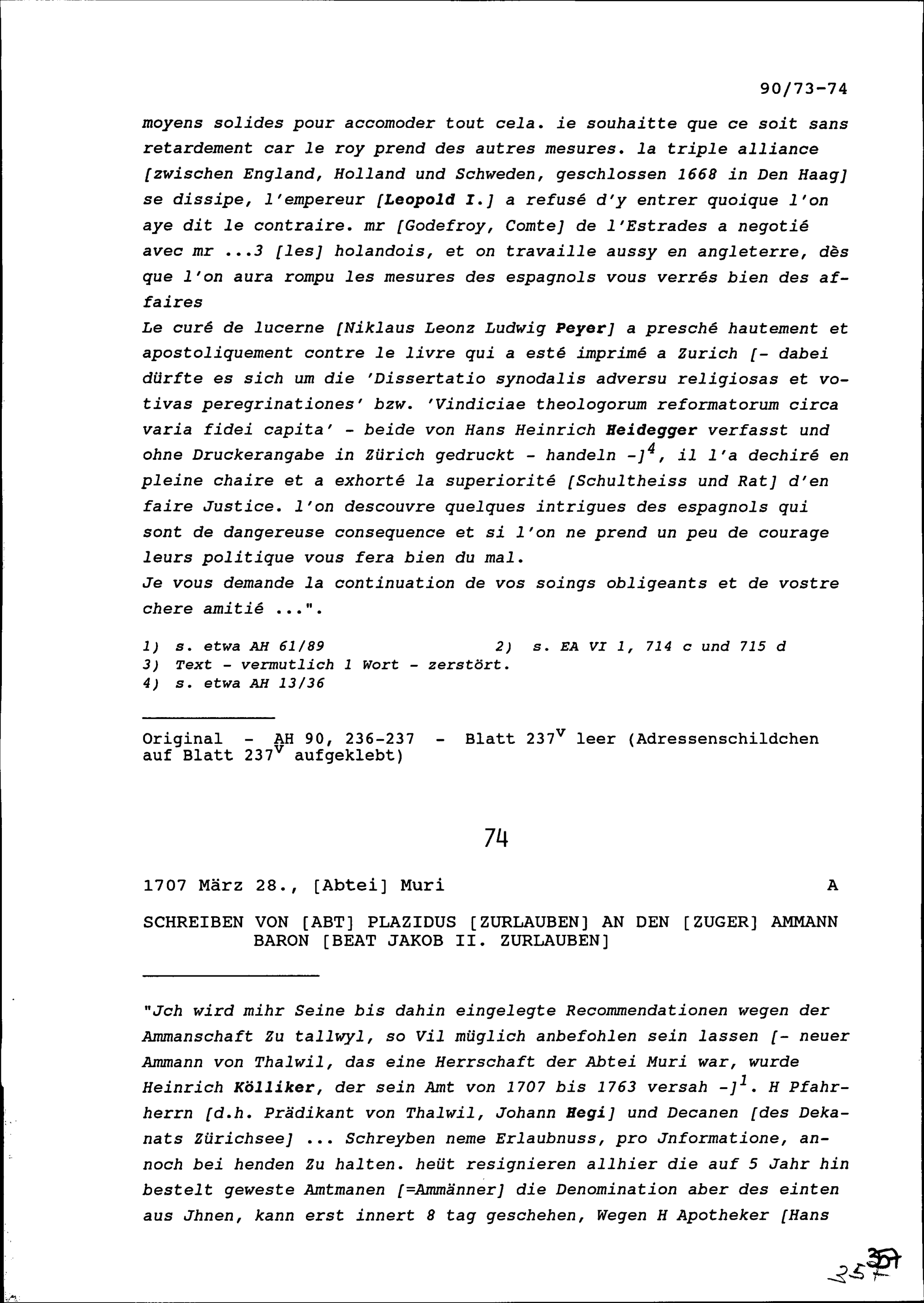 Schreiben von Victor-Emanuel de Bertrand, Sieur de la Pérouse, Ambassador von Frankreich, an Beat Jakob I. Zurlauben, Statthalter, Zug