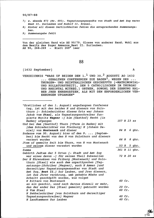 Abrechnung für Stadt und Amt Zug über die an der Jahrrechnung in Baden 1634 erhaltenen...