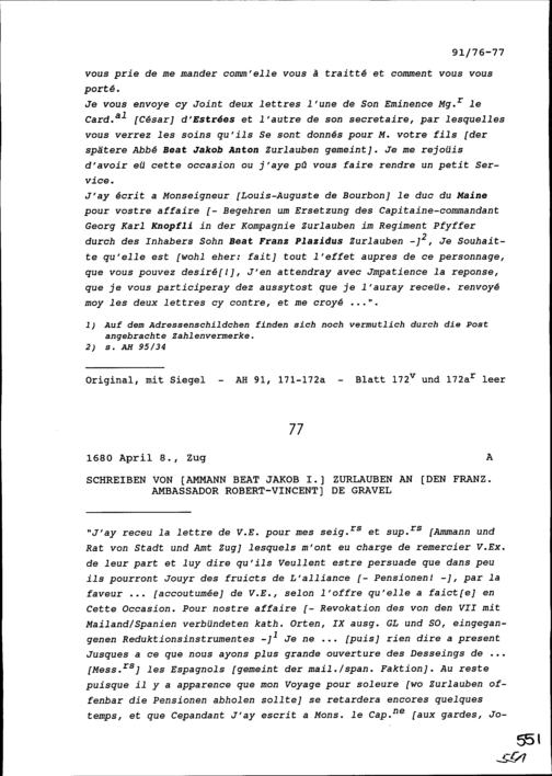Schreiben von Lorenzo Verzuso, Marchese di Beretti-Landi, Ambassador von Spanien, an Beat Jakob II. Zurlauben, Ammann und Hauptmann, Zug