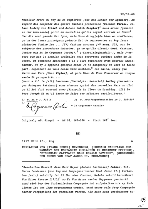 Schreiben von Jacques Vigier, französischer Dolmetscher, an Beat II. Zurlauben, Ammann und Gardehauptmann, Zug
