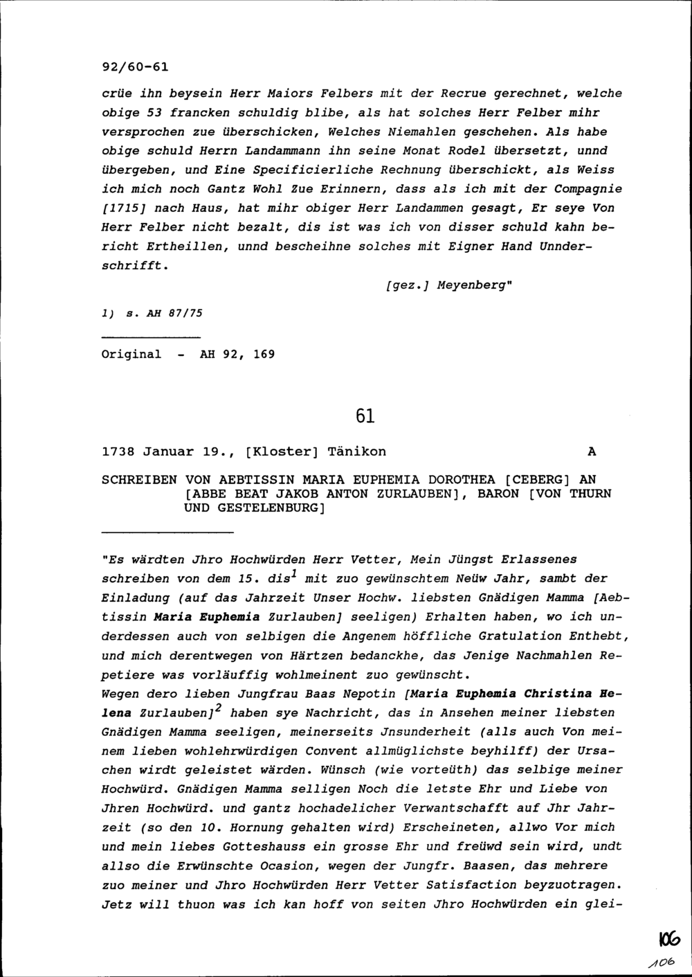 Erklärung von Franz Leonz Meyenberg, ehemals Kommandant der Kompanie Zurlauben im Regiment Pfyffer, gegenüber den Erben von Beat Jakob II. Zurlauben