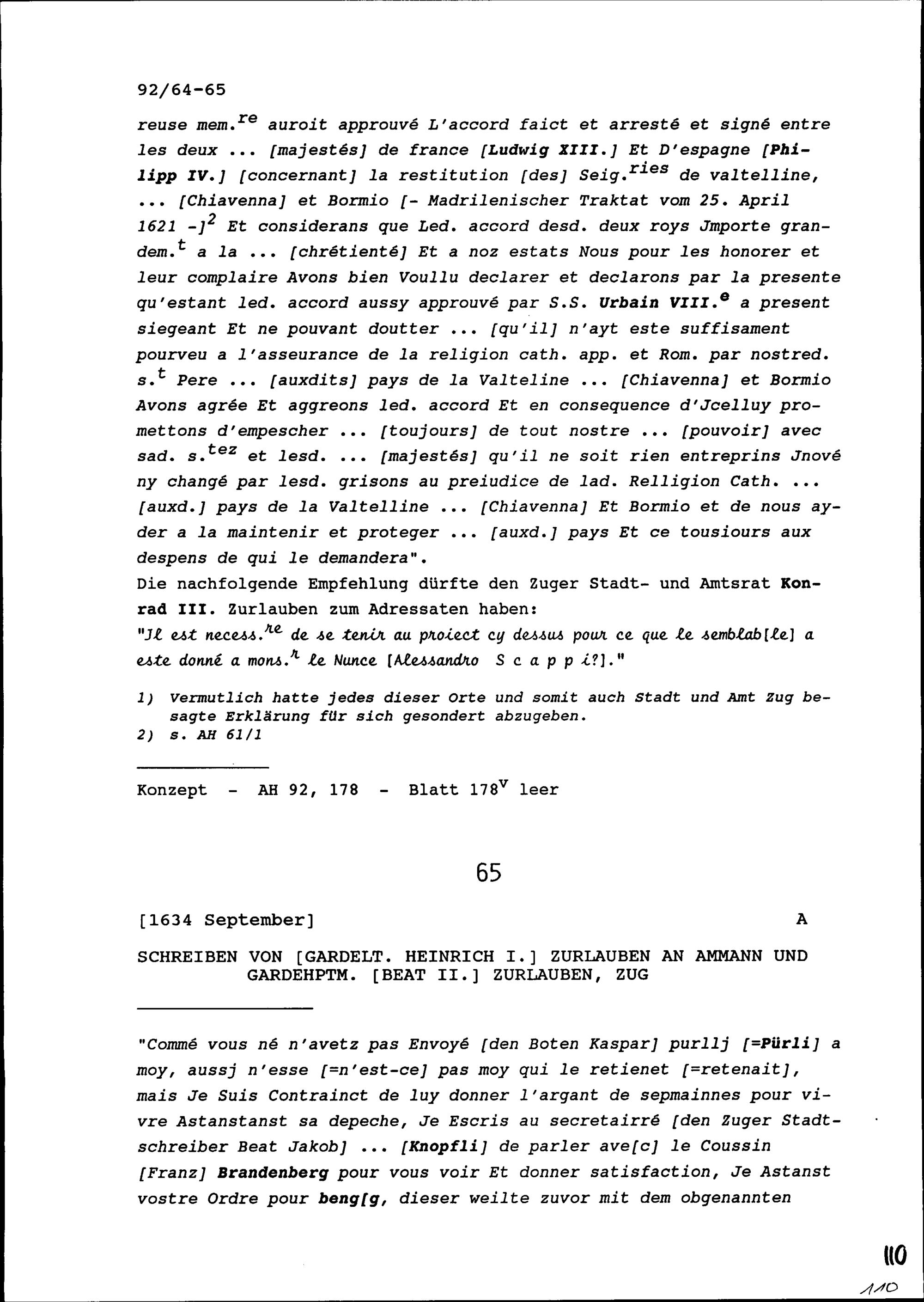 Erklärung der Fünf Katholischen Orte bezüglich der Restitution des Veltlins, von...