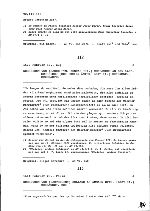 Schreiben von Barthélémy Rolland an Beat II. Zurlauben, Ammann und Hauptmann, Zu...