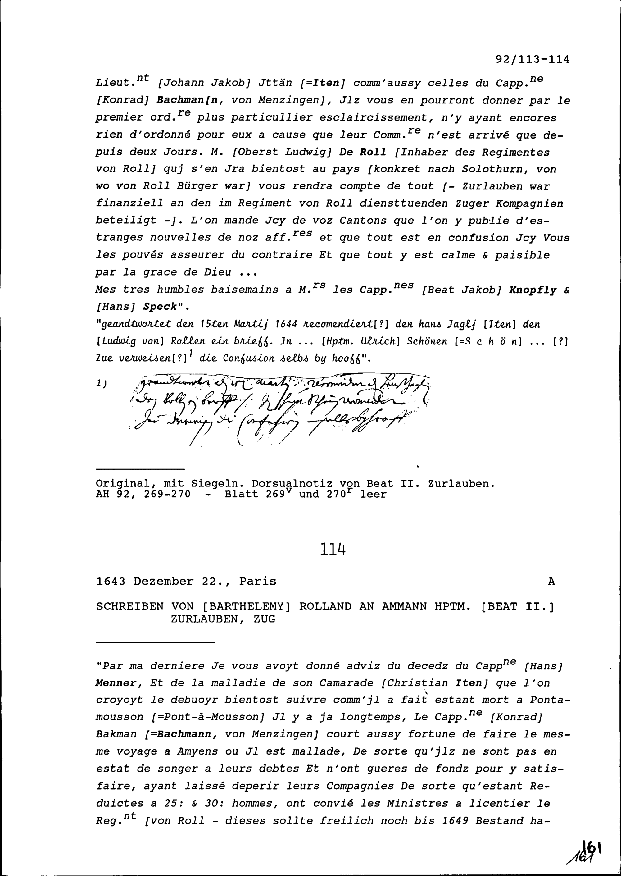 Schreiben von Barthélémy Rolland an Beat II. Zurlauben, Ammann und Hauptmann, Zu...