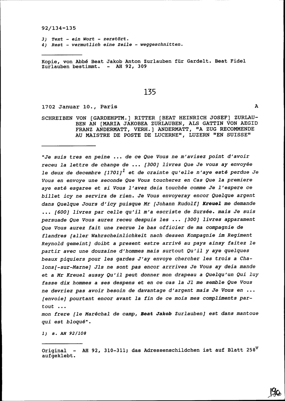 Schreiben von Beat Franz Plazidus Zurlauben, Gardeoberst, an Beat Jakob Anton Zurlauben, Priester