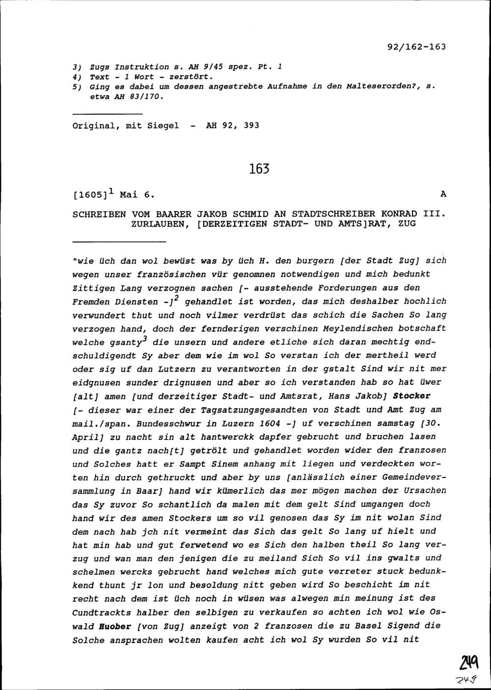 Schreiben von François de Bassompierre, ausserordentlicher Ambassador von Frankreich, an Konrad III. Zurlauben, Altammann und Stadt- und Amtrat, Zug