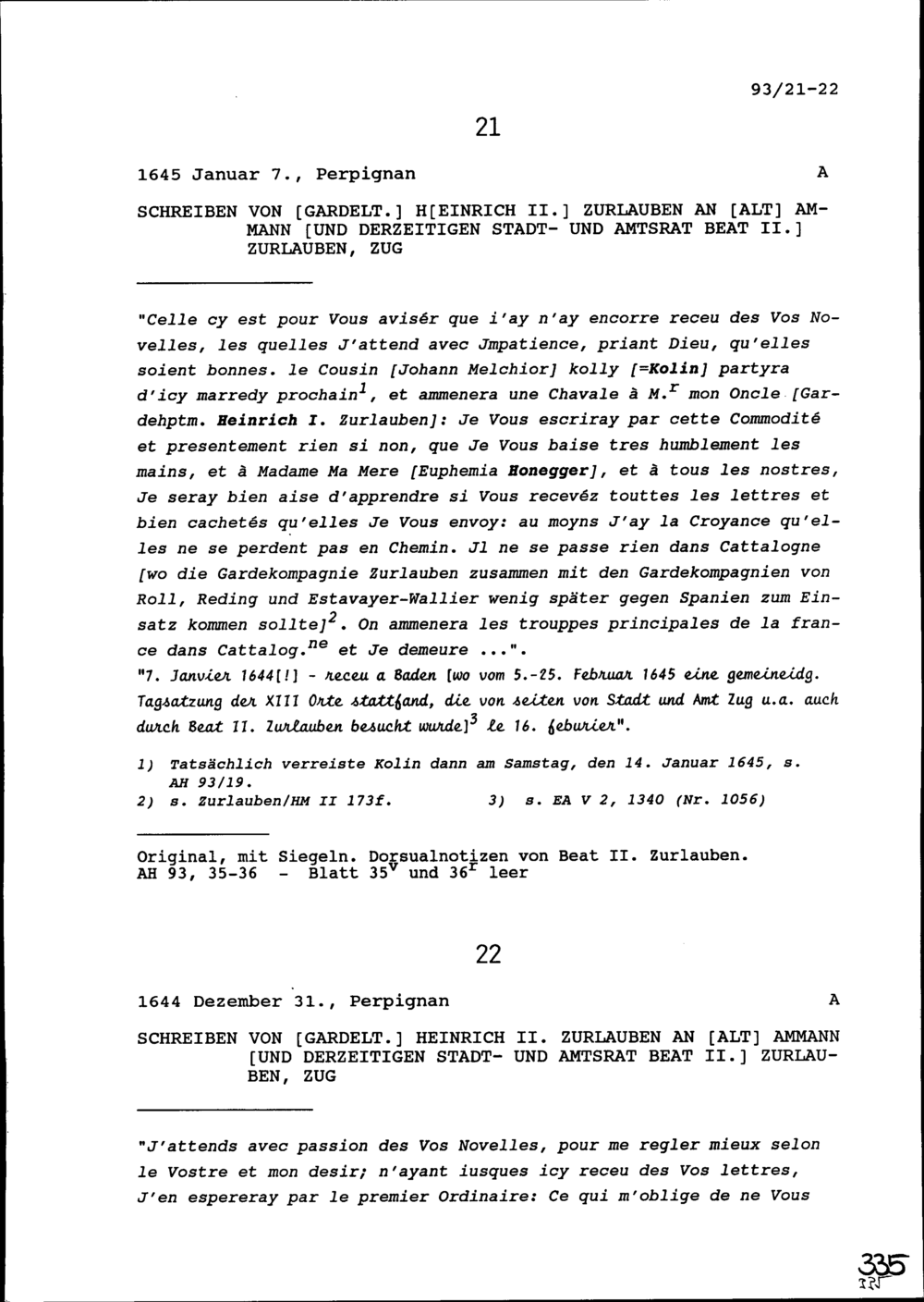 Schreiben von Heinrich II. Zurlauben, Gardeleutnant, an Beat II. Zurlauben, Altammann...
