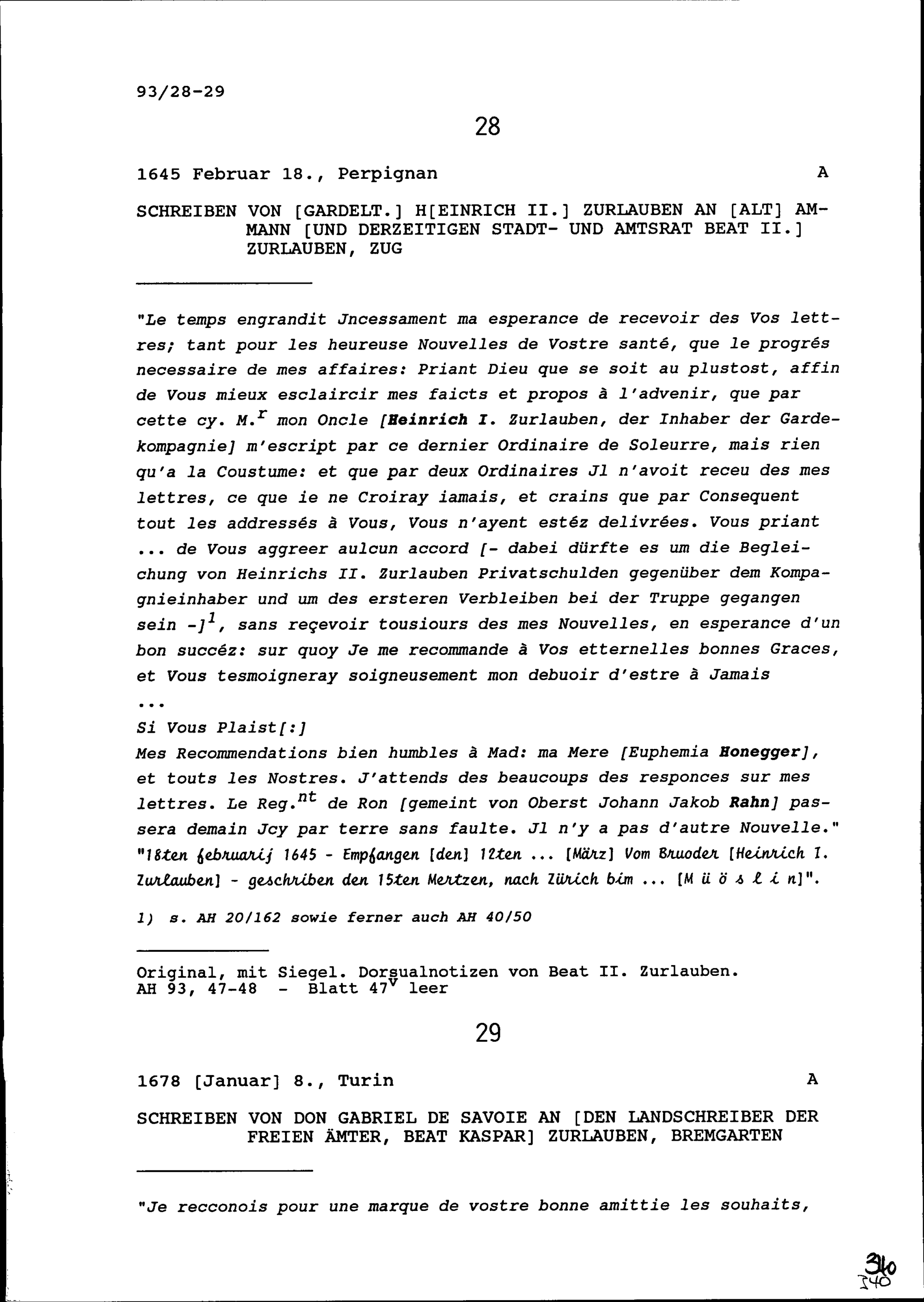 Schreiben von Don Gabriel von Savoyen an Beat Kaspar Zurlauben, Landschreiber der...