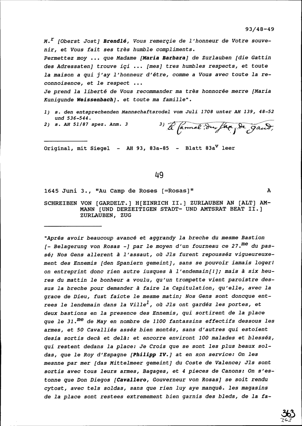 Schreiben von NN Acklin von Mandach, Hauptmann, an Beat Jakob II. Zurlauben, Altammann und Stadt- und Amtrat, Zug