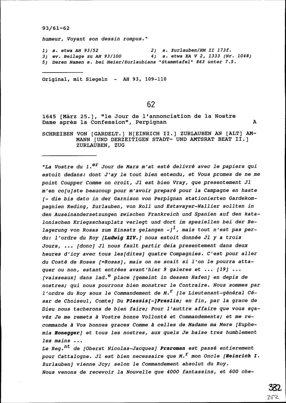 Schreiben von Heinrich II. Zurlauben, Gardeleutnant, an Beat II. Zurlauben, Altammann und Stadt- und Amtrat, Zug
