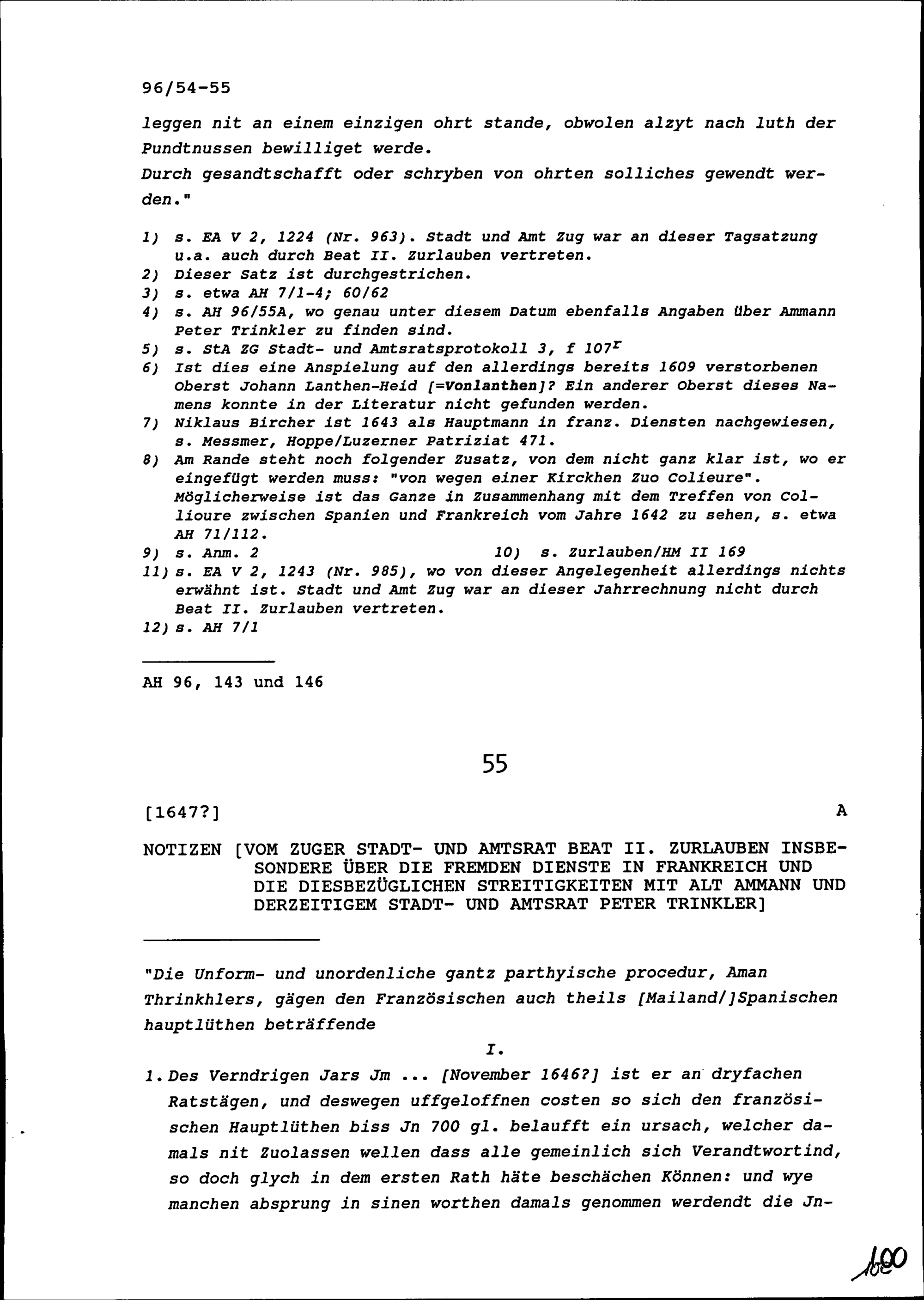Notiz von Beat II. Zurlauben, Stadt- und Amtrat Zug, insbesondere über Fragen der Fremden Dienste in Frankreich