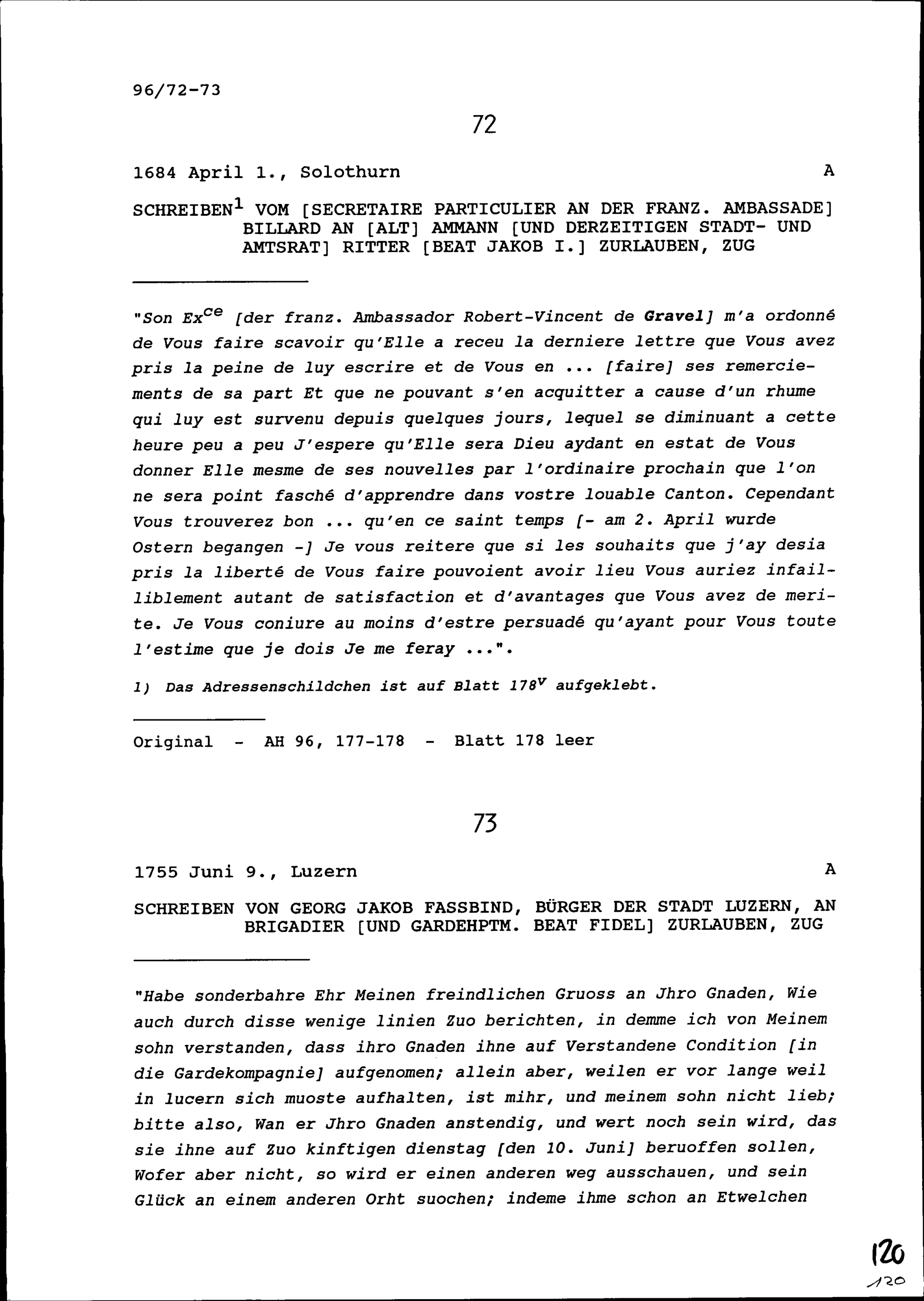 Schreiben von Georg Jakob Fassbind, Bürger der Stadt Luzern, an Beat Fidel Zurlauben, Brigadier und Gardehauptmann, Zug