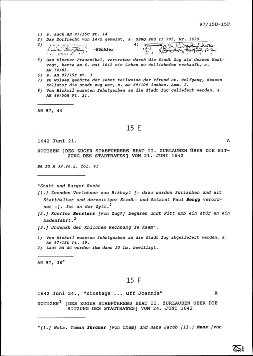 Notiz von Beat II. Zurlauben, Stabführer der Stadt Zug, über die Sitzung des Stadtrats vom 24. Juni 1642