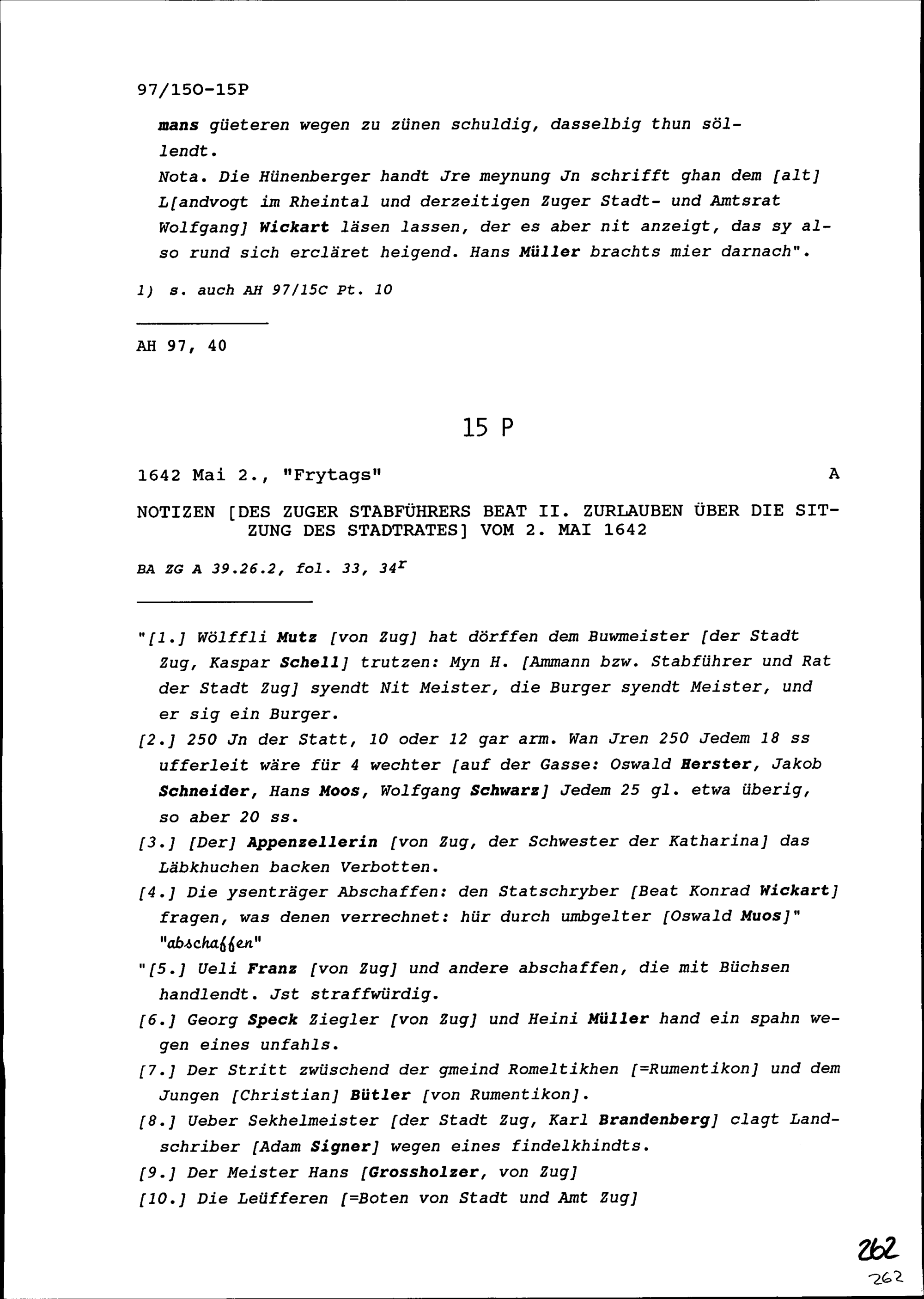 Notiz von Beat II. Zurlauben, Stabführer der Stadt Zug, über die Sitzung des Stadtrats vom 26. April 1642