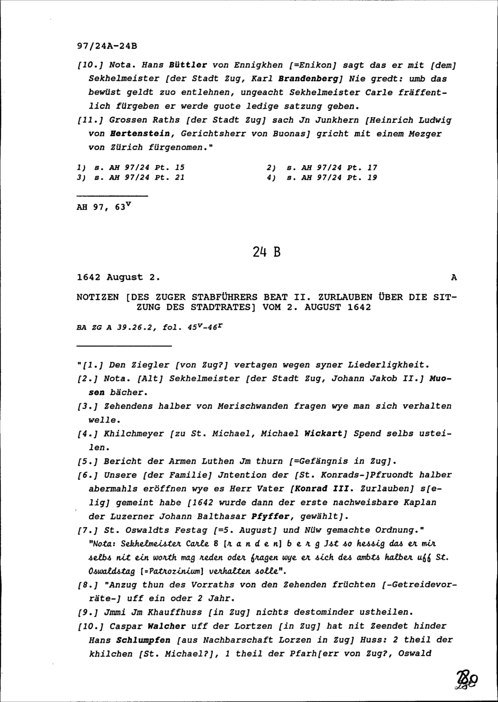 Notiz von Beat II. Zurlauben, Stabführer der Stadt Zug, über die Sitzung des Stadtrats vom 24. Juli 1642