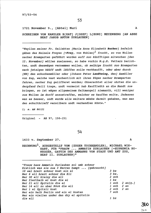 Rechnung für Euphemia Honegger, Gattin von Beat II. Zurlauben, ausgestellt von Michael Wickart, Zuger Tuchhändler