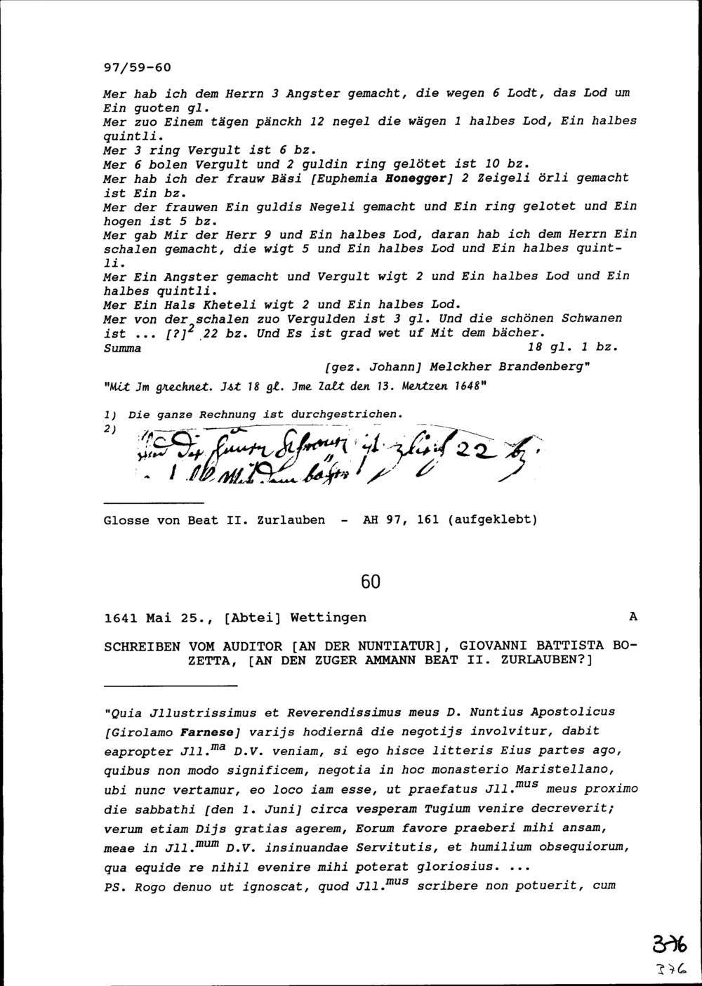 Rechnung für Beat II. Zurlauben, Altammann und Stadt- und Amtrat Zug, ausgestellt von Melchior I. Brandenberg, Zuger Goldschmied Johann