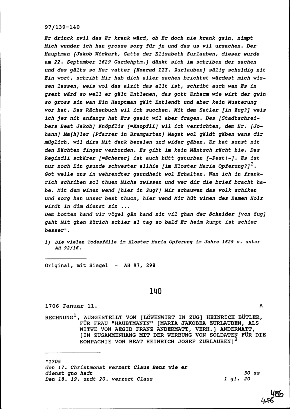 Schreiben von Elisabeth Zurlauben an Beat II. Zurlauben, Landschreiber der Freien Ämter und Stadt- und Amtrat, Bremgarten