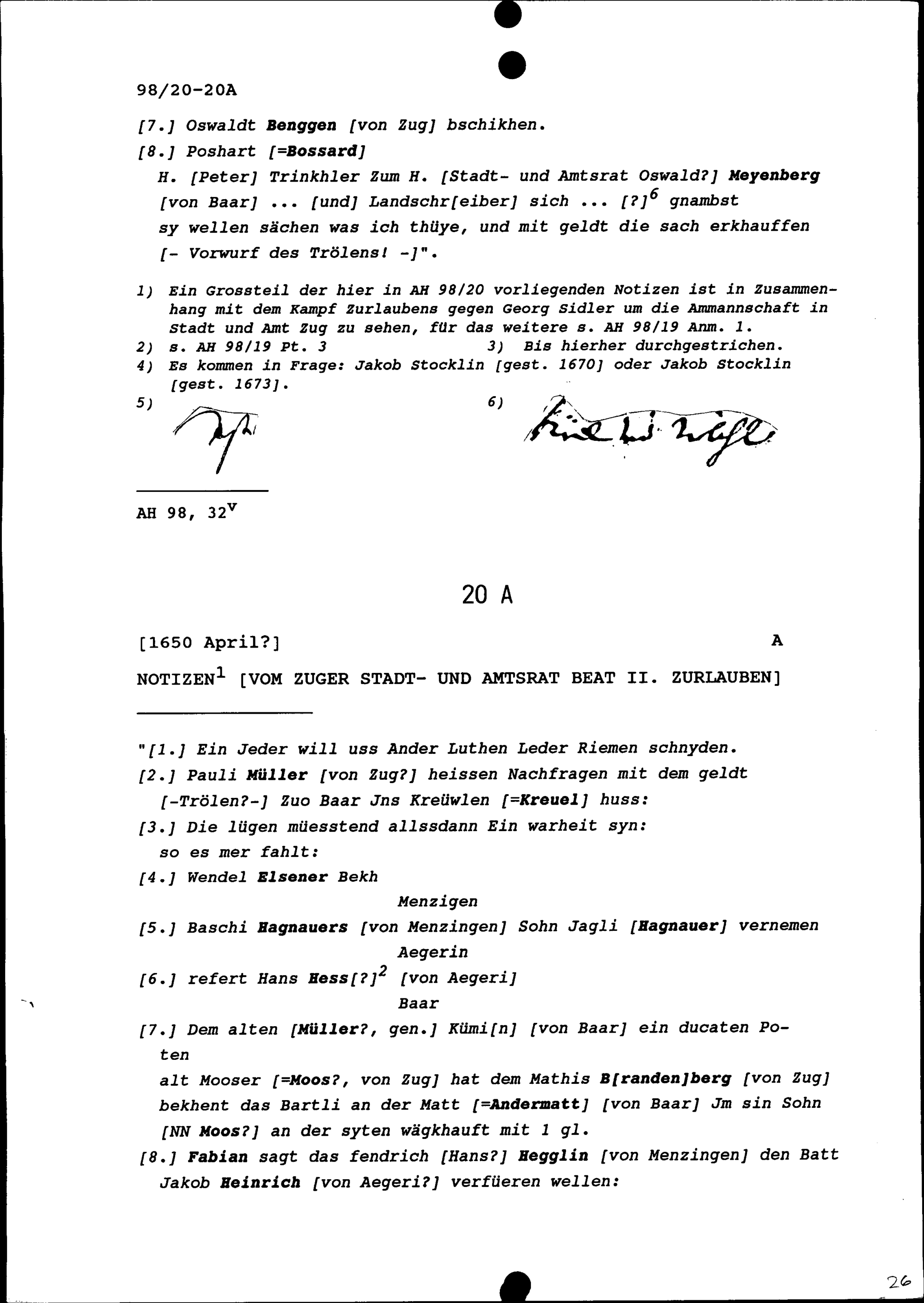 Notiz von Beat II. Zurlauben, Stadt- und Amtrat Zug