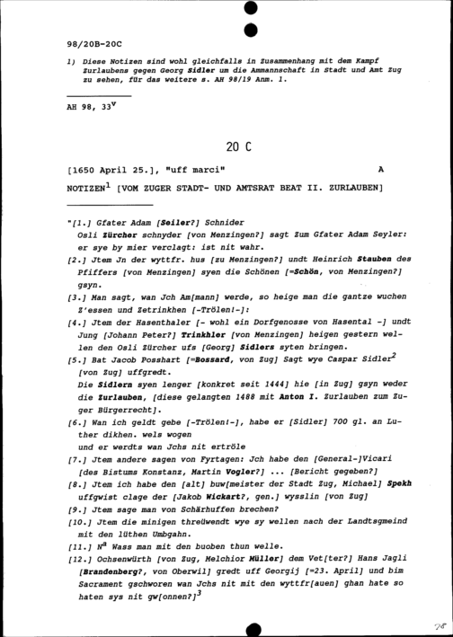 Notiz von Beat II. Zurlauben, Stadt- und Amtrat Zug
