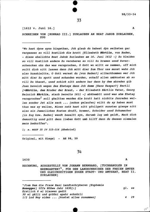 Rechnung für Beat II. Zurlauben, Landschreiber der Freien Ämter und Stadt- und Amtrat Zug, ausgestellt von Johann Bernhard, Tuchhändler in Bremgarten