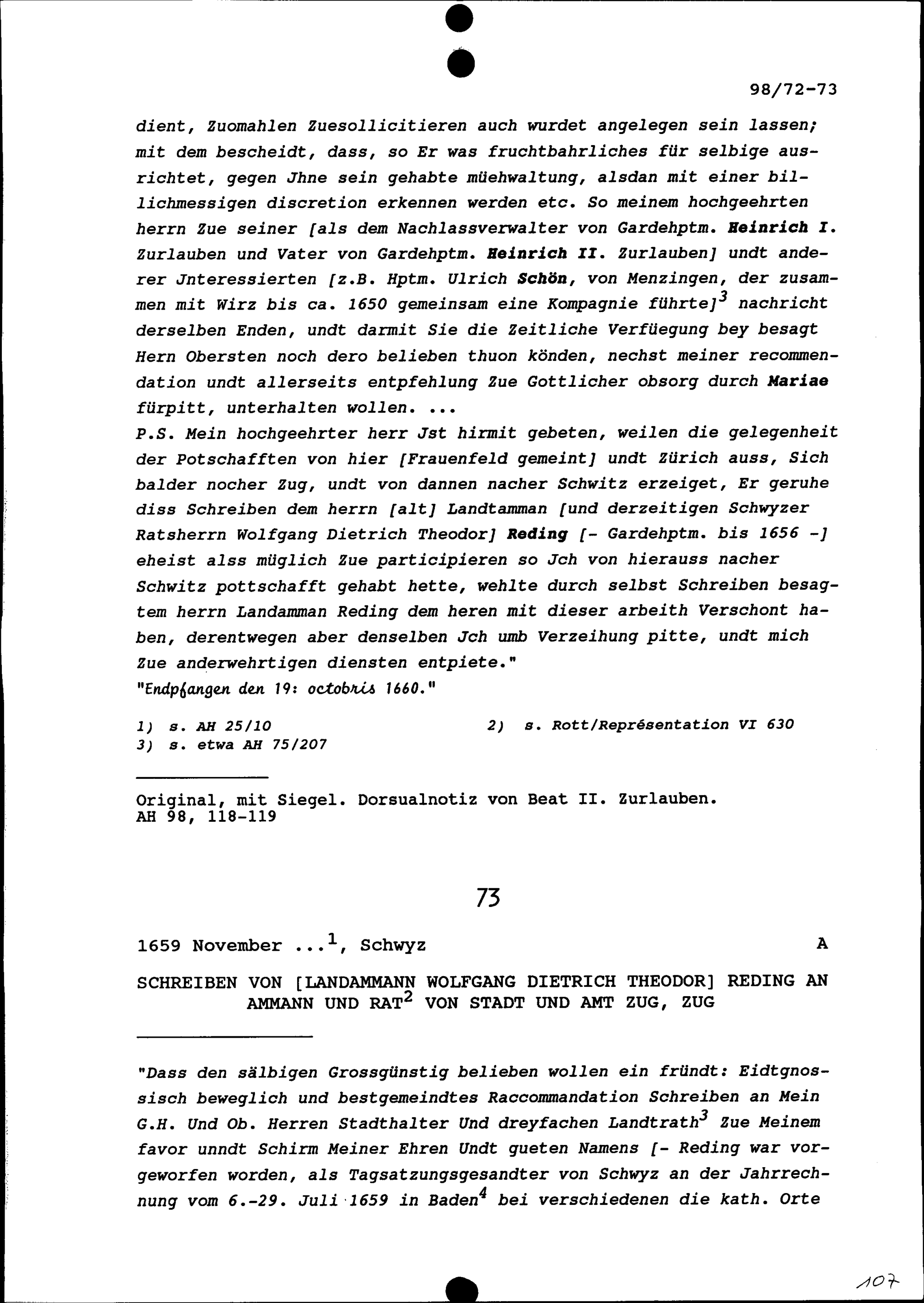 Schreiben von Johann Franz Ulrich Wirz, Hauptmann, an Beat II. Zurlauben, Altammann...