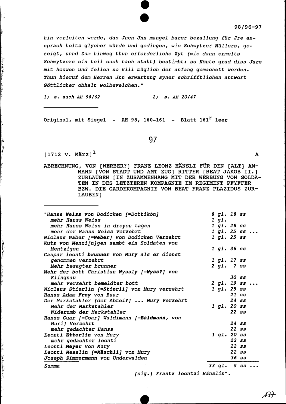 Schreiben von Hans Rudolf Rahn, Statthalter, an Beat II. Zurlauben, Hauptmann und Stadt- und Amtrat, Zug