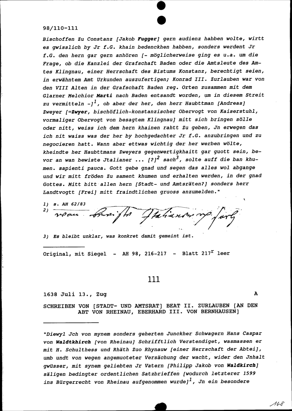 Schreiben von Johann Jakob Mirgel, Weihbischof und Bischof von Sebaste, an Konrad III. Zurlauben, Statthalter, Zug
