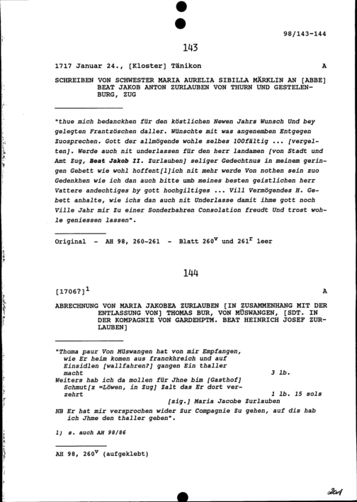 Abrechnung von Maria Jakobea Zurlauben in Zusammenhang mit der Entlassung von Thomas Bur, von Müswangen, Soldat in der Kompanie von Beat Heinrich Josef Zurlauben, Gardehauptmann,