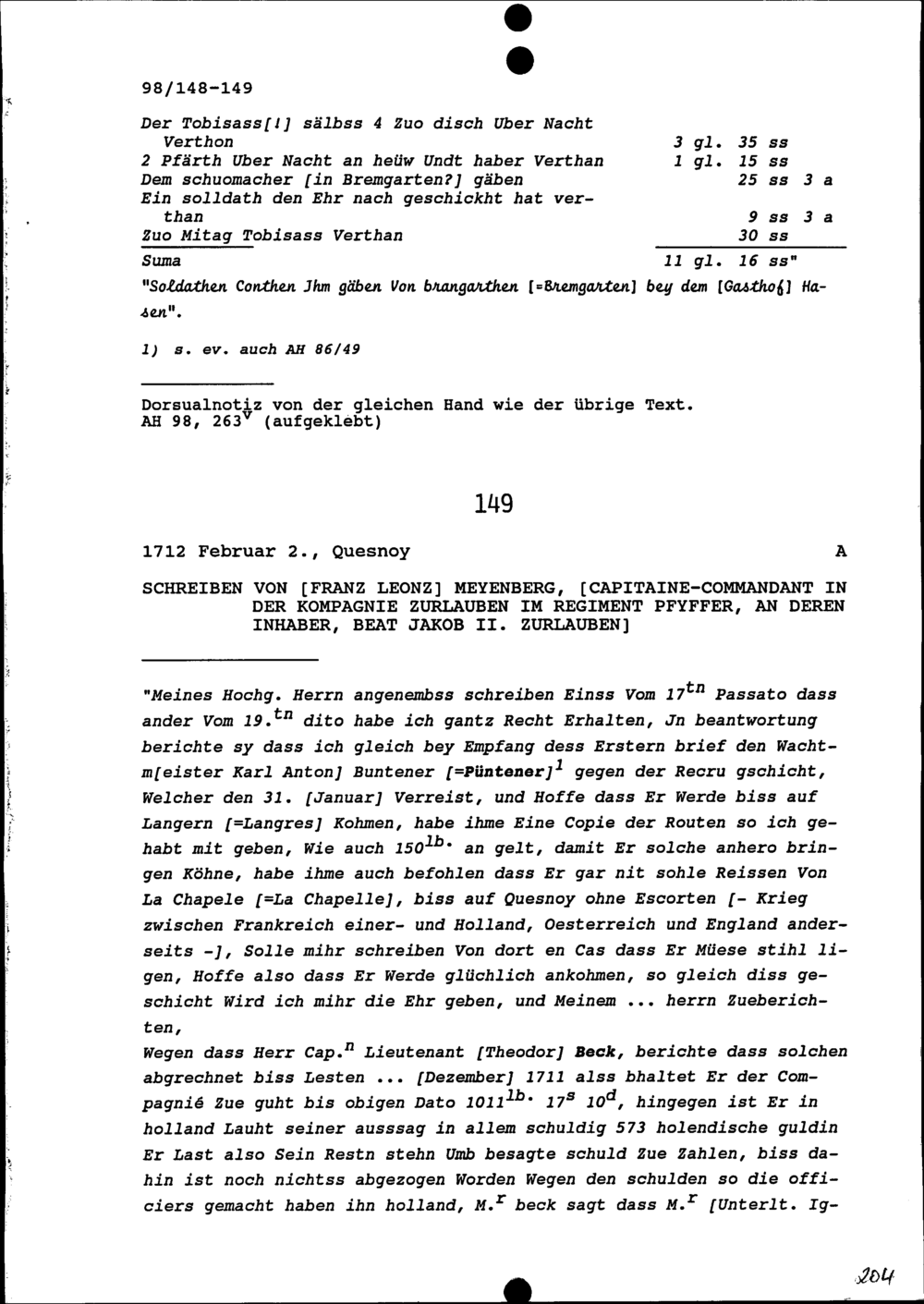 Abrechnung in Zusammenhang mit der Werbung von Soldaten durch Tobias Brassel, Adlerwirt von Sankt Margrethen, für die Kompanie von Beat Jakob II. Zurlauben im Regiment Pfyffer