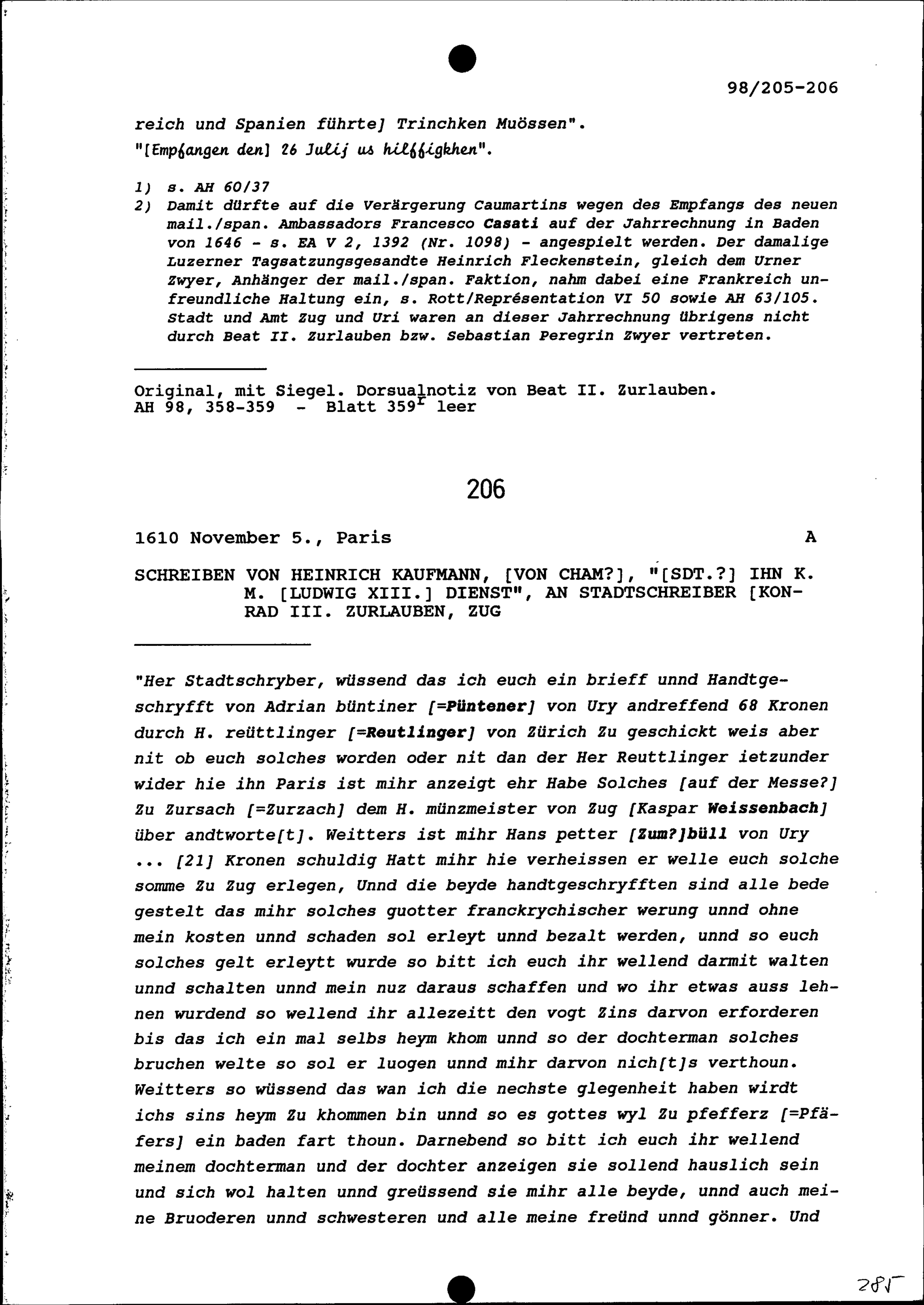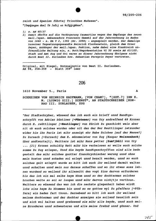 Schreiben von Sebastian Peregrin Zwyer, Gerichtsherr, an Beat II. Zurlauben, Altammann und Stadt- und Amtrat, Zug
