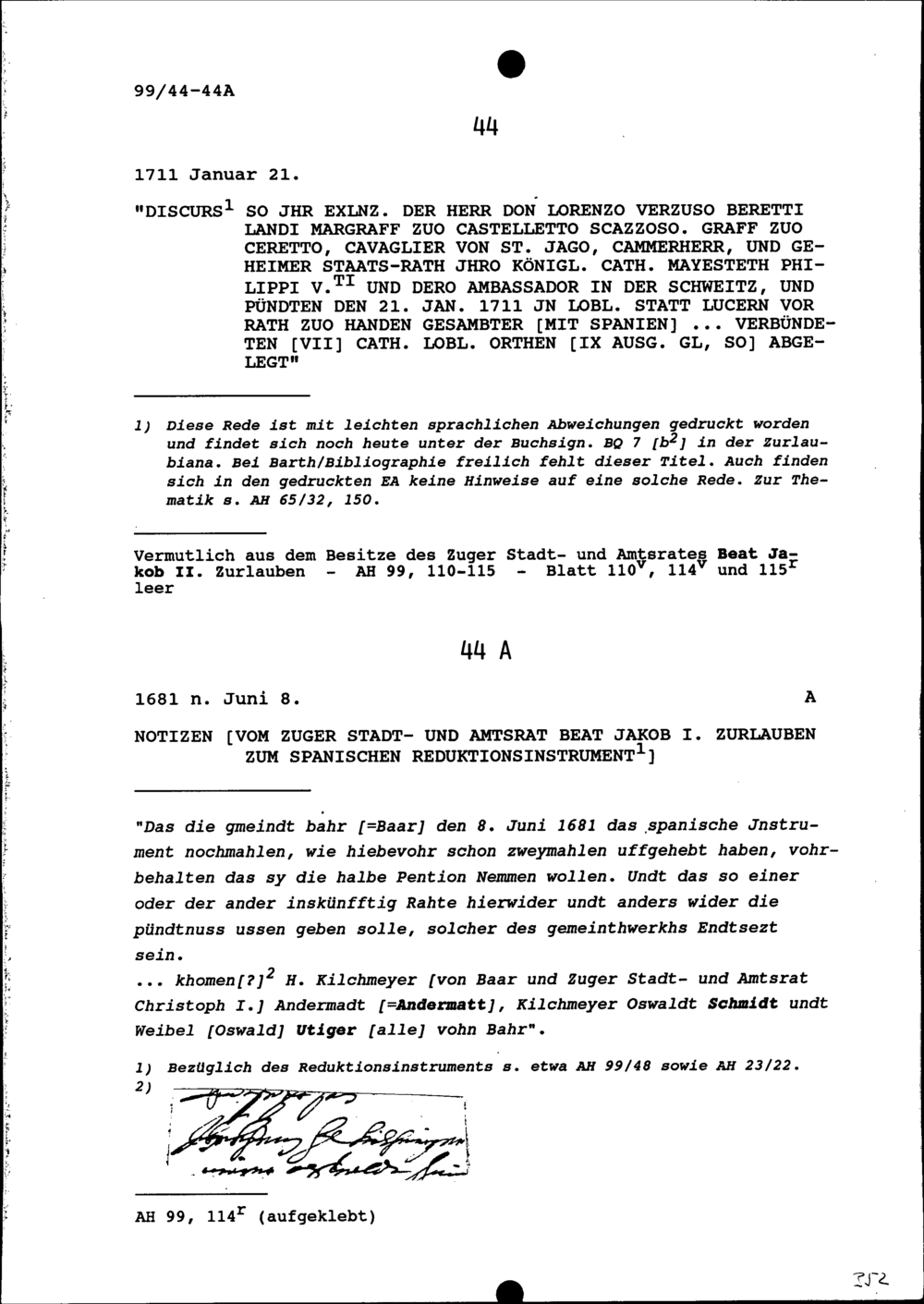 Notiz von Beat Jakob I. Zurlauben, Stadt- und Amtrat Zug, zum spanischen Reduktionsinstrument