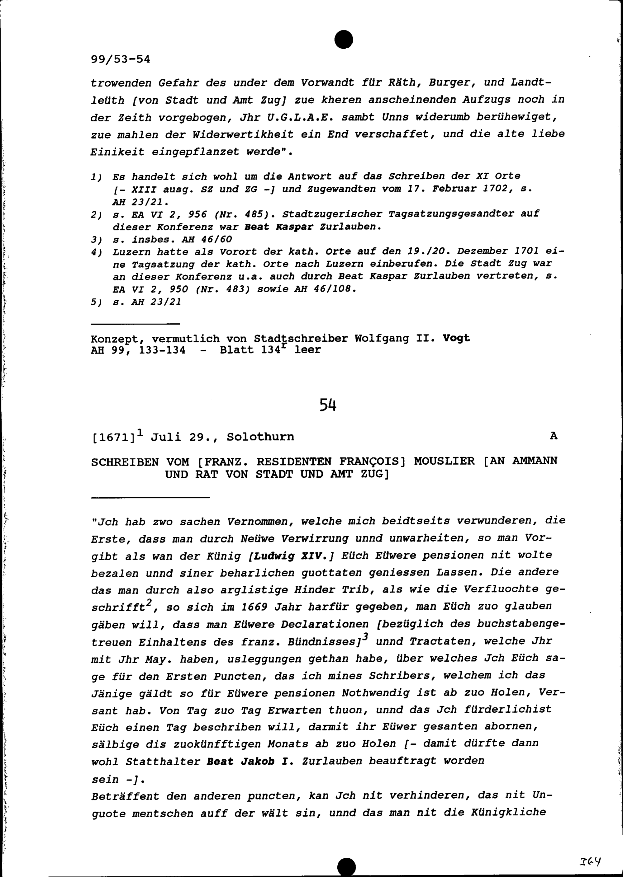 Schreiben des Statthalters, Rats und der Bürger der Stadt Zug an die Tagsatzungsgesandten der Elf Orte sowie der Zugewandten Orte, auf der am 8. Februar 1702 begonnenen Tagsatzung in Baden