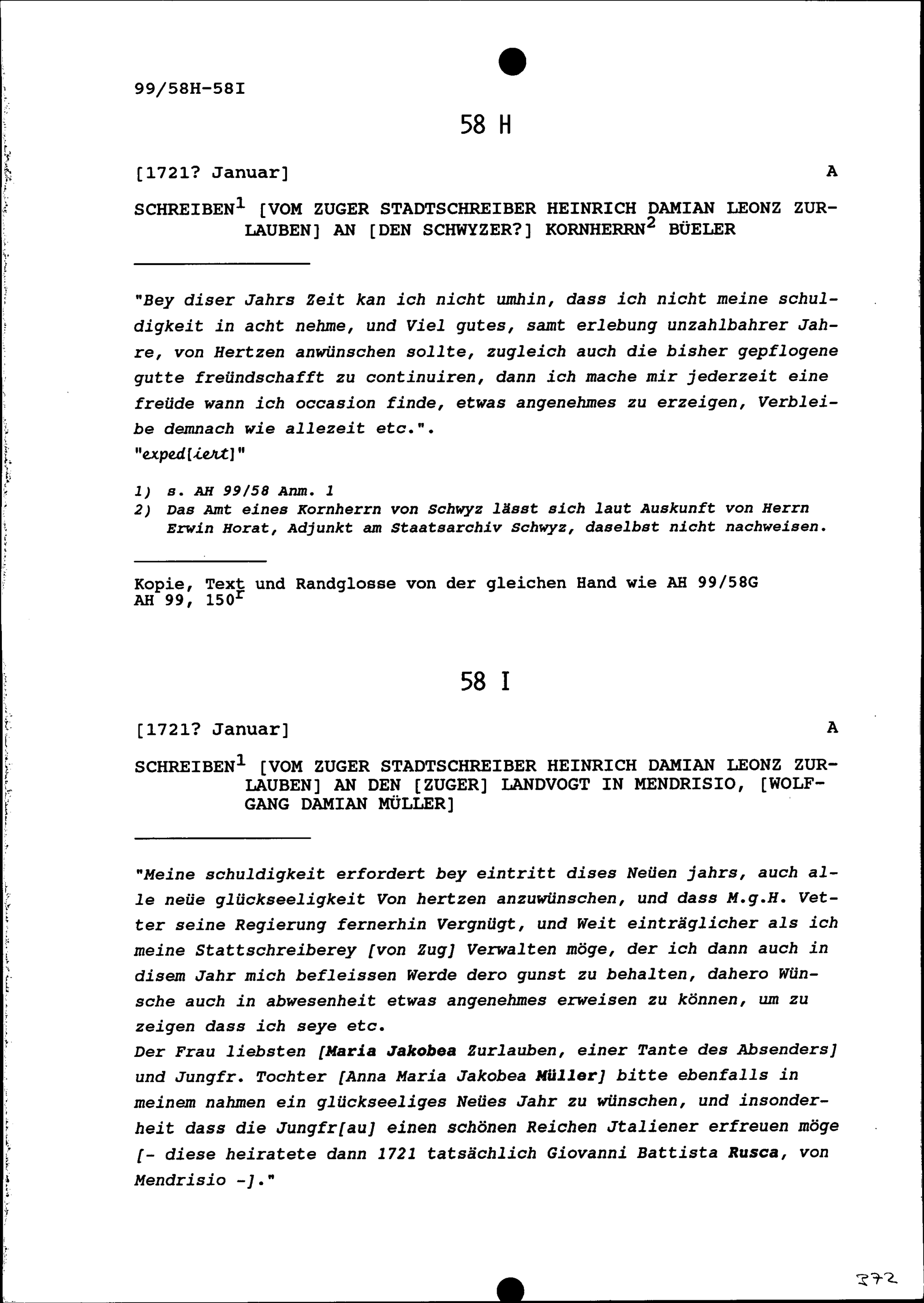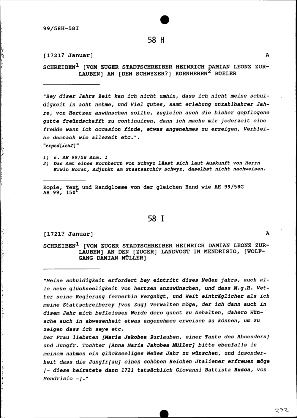 Schreiben von Heinrich Damian Leonz Zurlauben, Zuger Stadtschreiber, an Wolfgang Damian Müller, Zuger Landvogt in Mendrisio