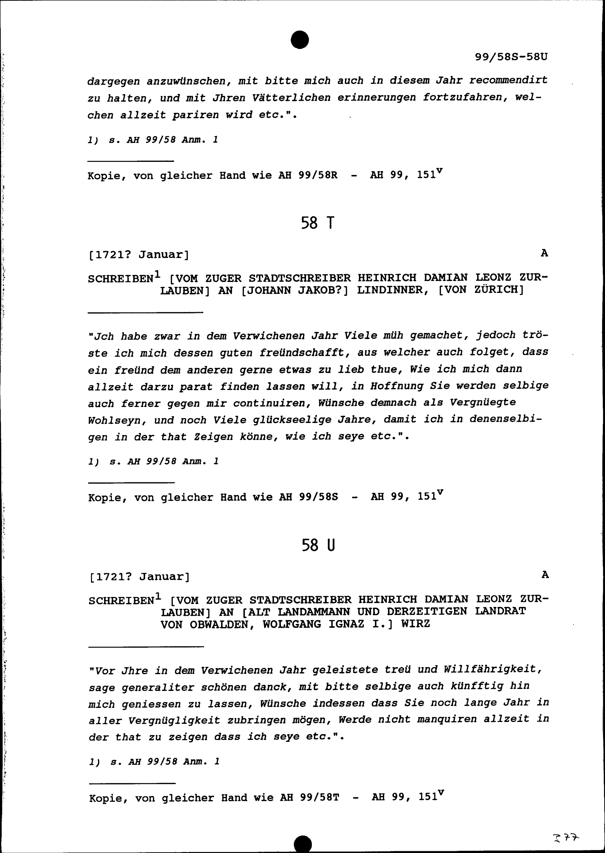 Schreiben von Heinrich Damian Leonz Zurlauben, Zuger Stadtschreiber, an Wolfgang...