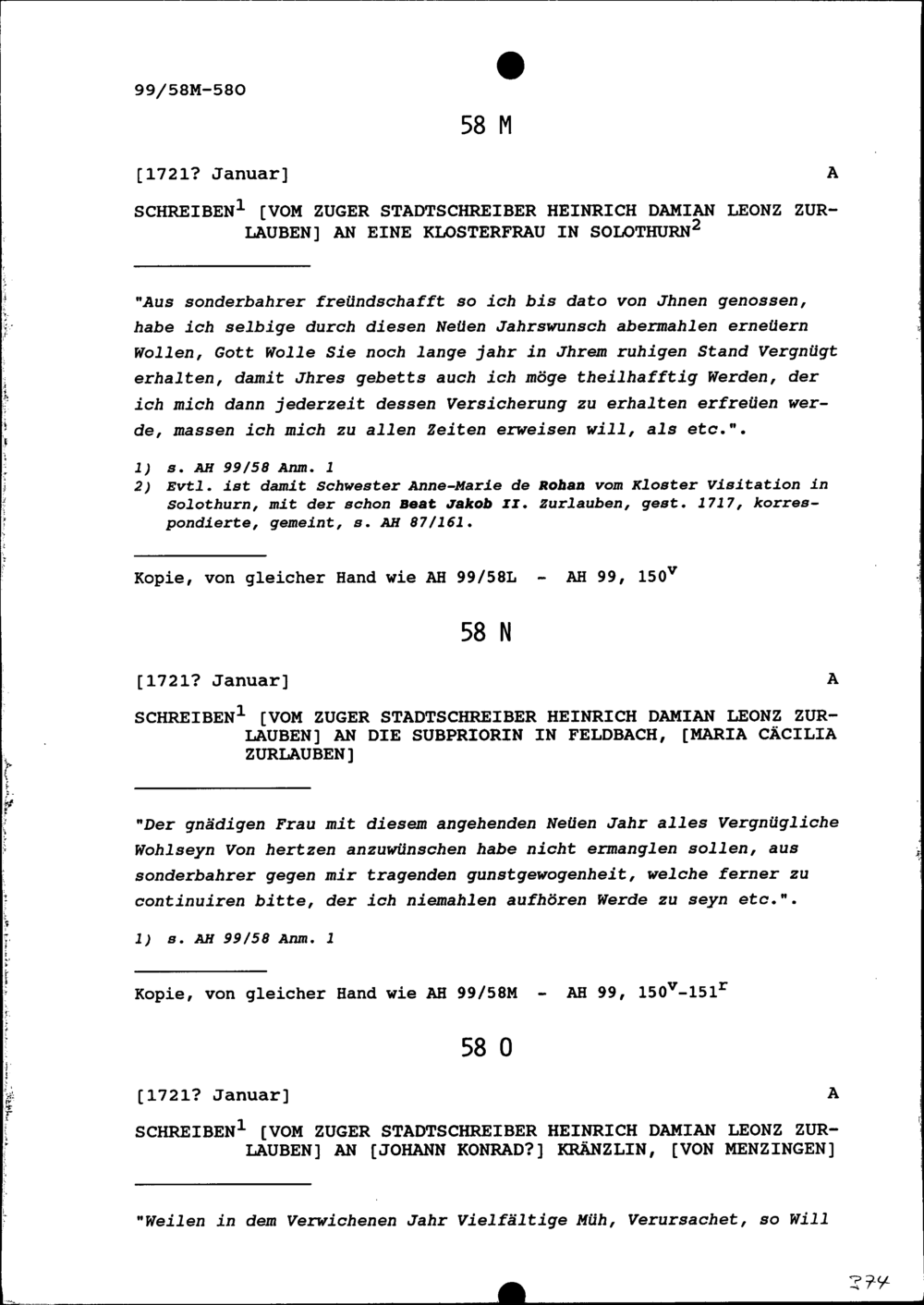 Schreiben von Heinrich Damian Leonz Zurlauben, Zuger Stadtschreiber, an Johann Konrad Kränzlin, Menzingen