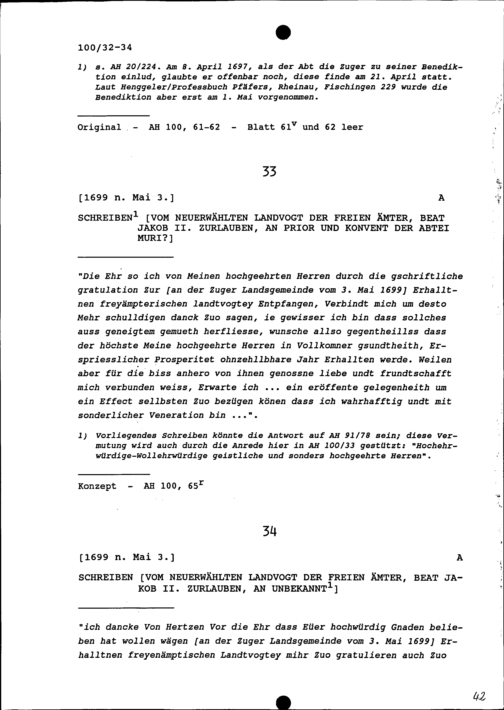 Schreiben von Beat Jakob II. Zurlauben, Landvogt der Freien Ämter, an Unbekannt