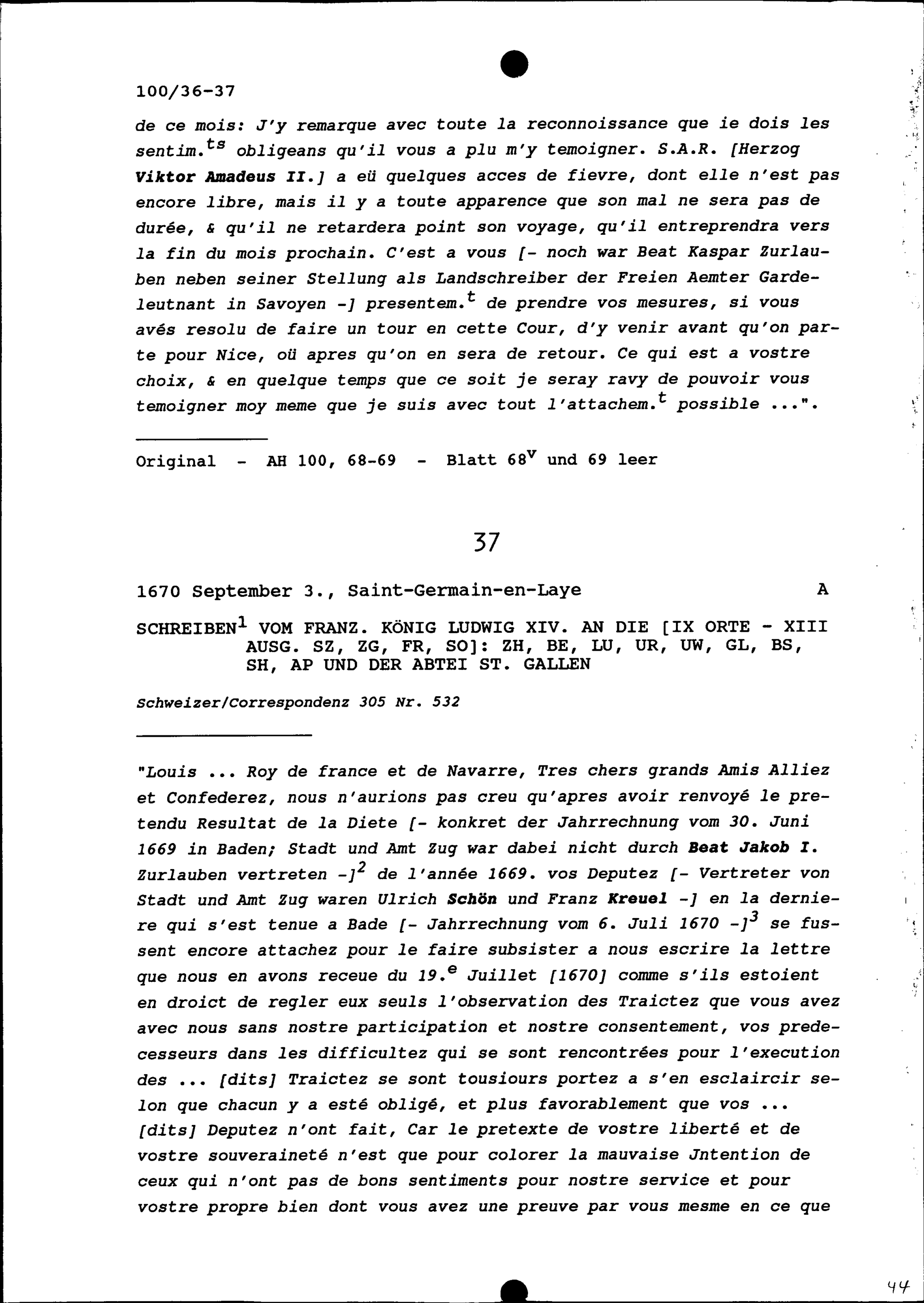 Schreiben von Charles-Joseph-Victor Carron, Marquis de Saint-Thomas, Geschäftsträger Savoyens, an Beat Kaspar Zurlauben