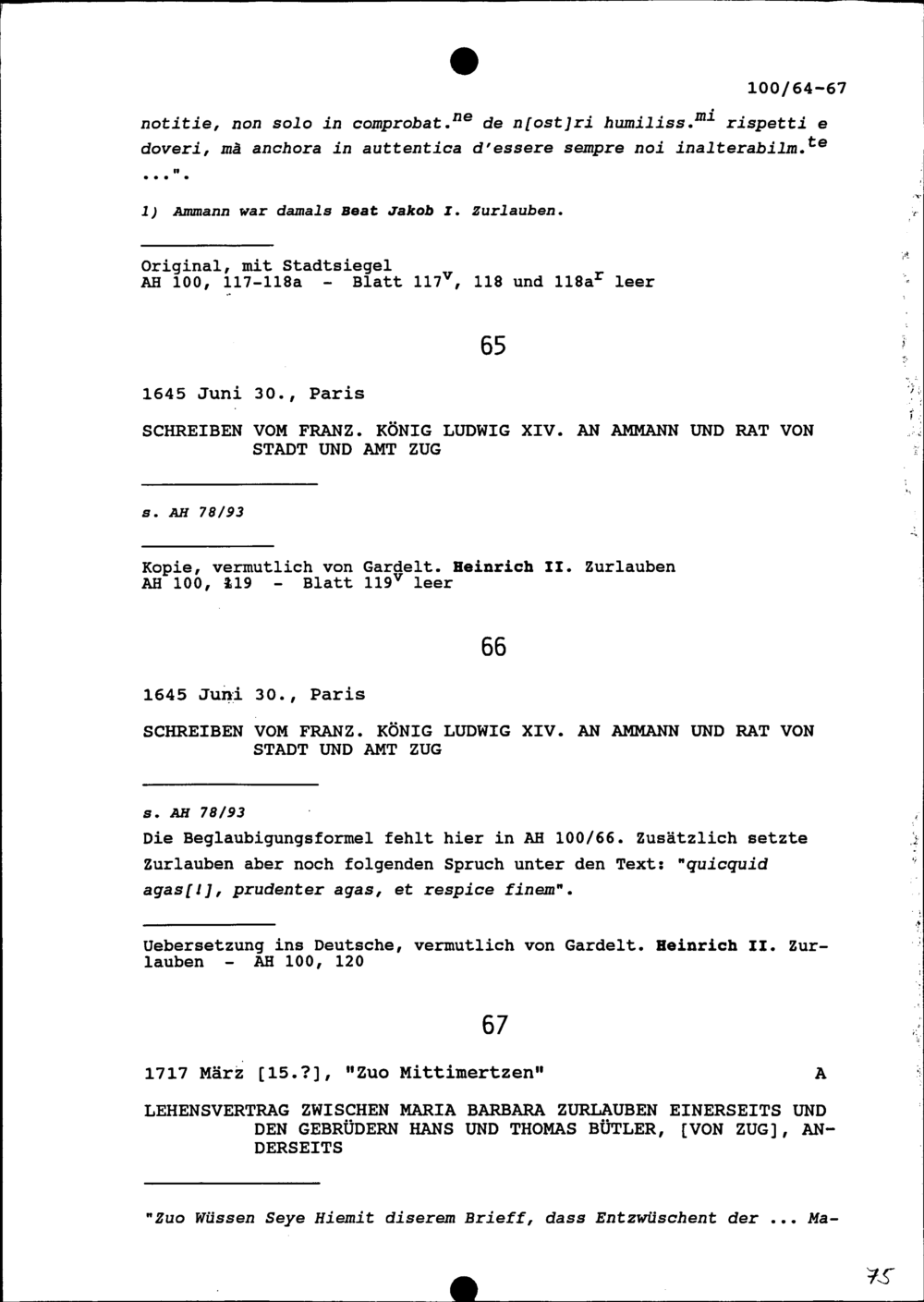 Schreiben von Ludwig XIV., König von Frankreich, an Ammann und Rat von Stadt und Amt Zug