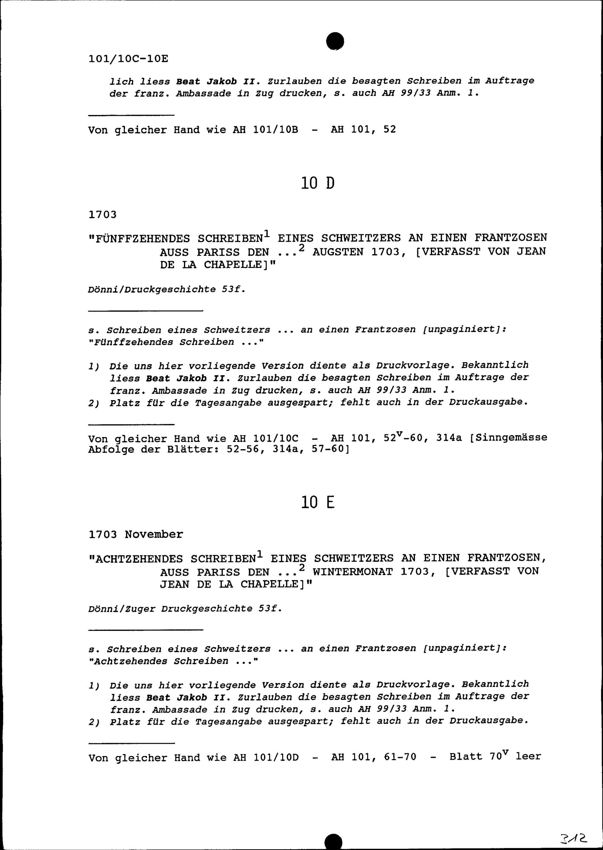 Druck: Jean de La Chapelle: Schreiben eines Schweitzers, der sich in Franckreich auffhaltet, an einen Frantzosen, welcher in der Schweitz sich gesetzt hat. [S.l.], 1704, Bericht an den Leser, eine Antwort auf die Schreiben eines Schweizers an einen Franzosen aus Paris Oktober 1703