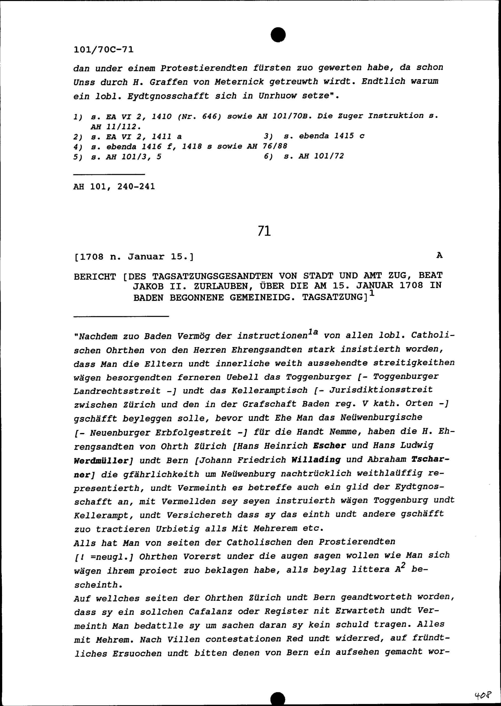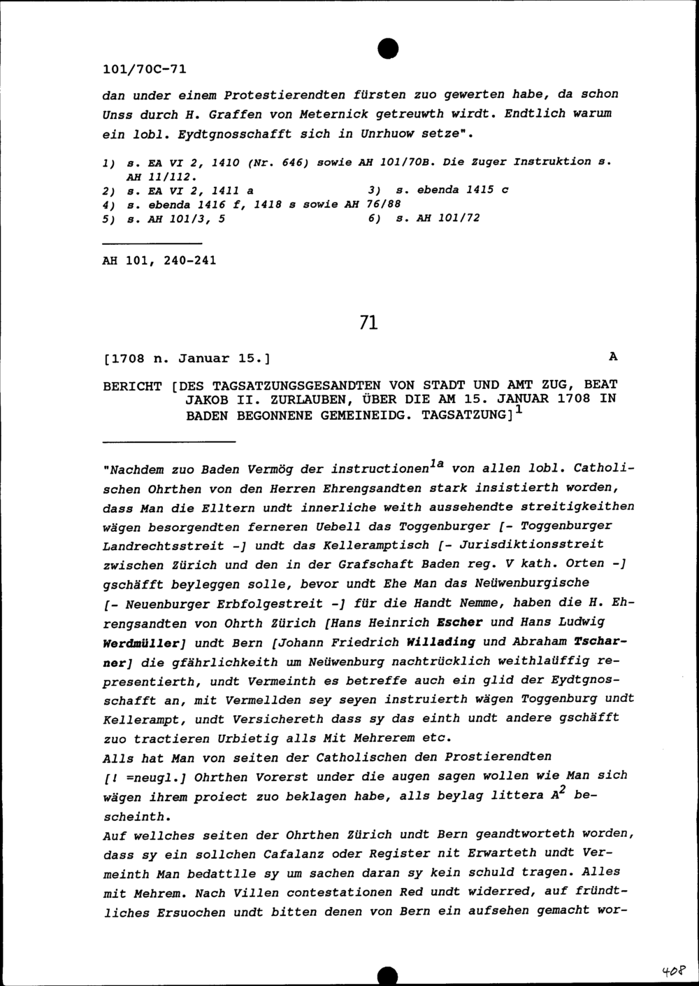 Bericht von Beat Jakob II. Zurlauben, Tagsatzungsgesandter von Stadt und Amt Zug, über die am 15. Januar 1708 in Baden begonnene Tagsatzung
