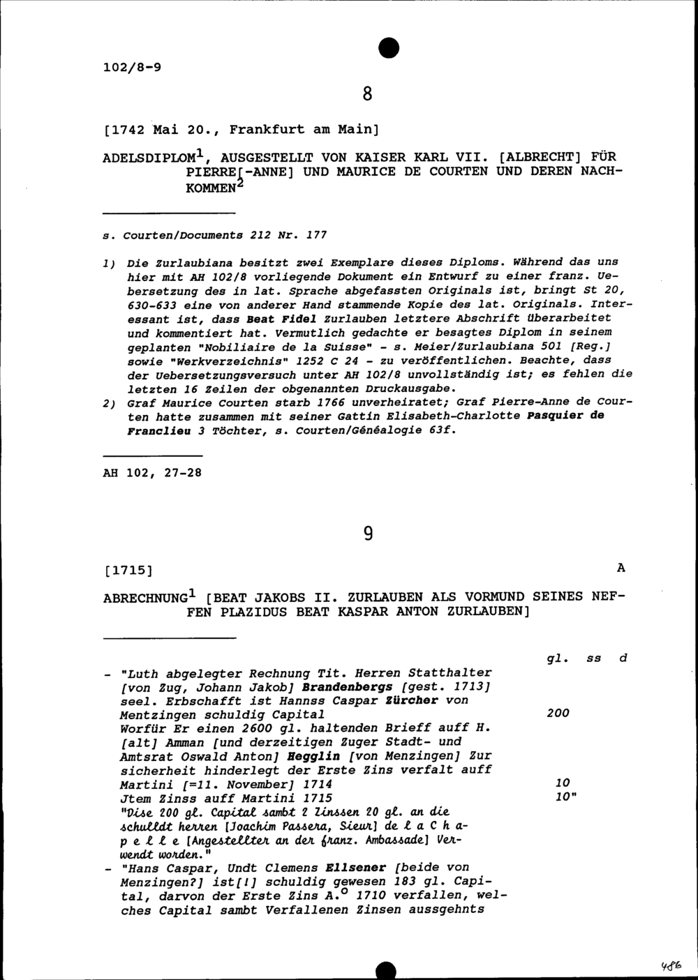 Abrechnung von Beat Jakob II. Zurlauben, Vormund von Plazidus Beat Kaspar Anton Zurlauben, sein Neffe