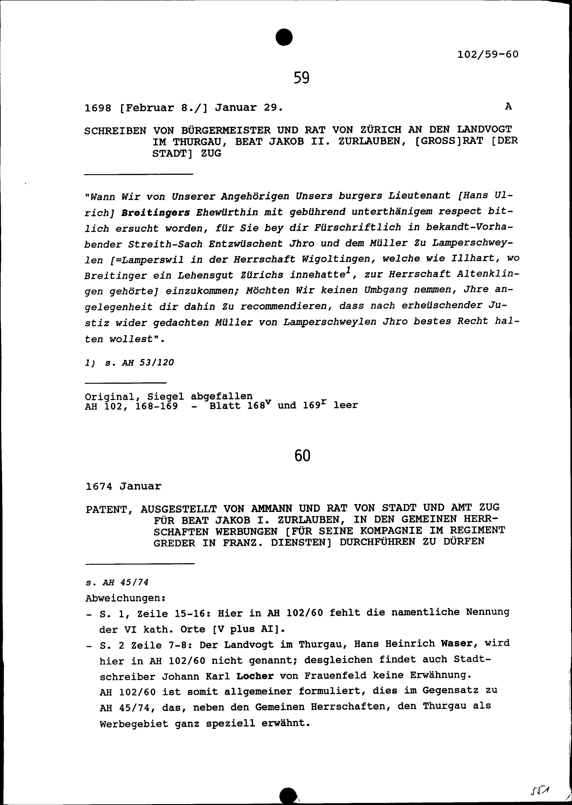 Patent, ausgestellt von Ammann und Rat von Stadt und Amt Zug für Beat Jakob I. Zurlauben, in den Gemeinen Herrschaften Werbungen für seine Kompanie im Regiment Greder in französischen Diensten durchführen zu dürfen
