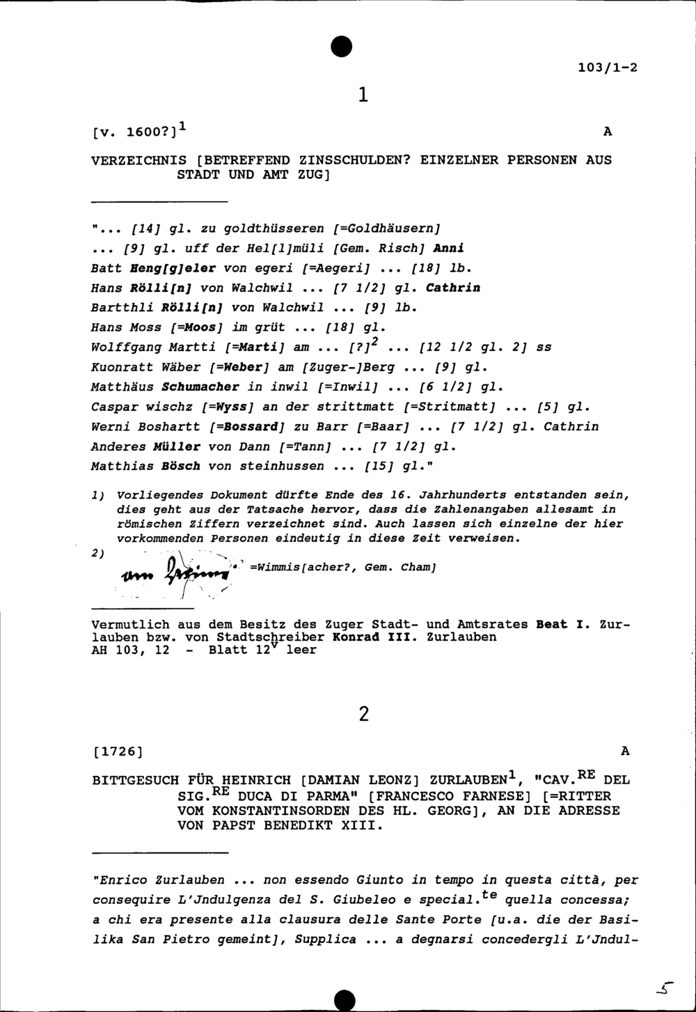 Bittgesuch für Heinrich Damian Leonz Zurlauben, an Francesco Farnese, Ritter vom Konstantinsorden, an Benedikt XII., Papst